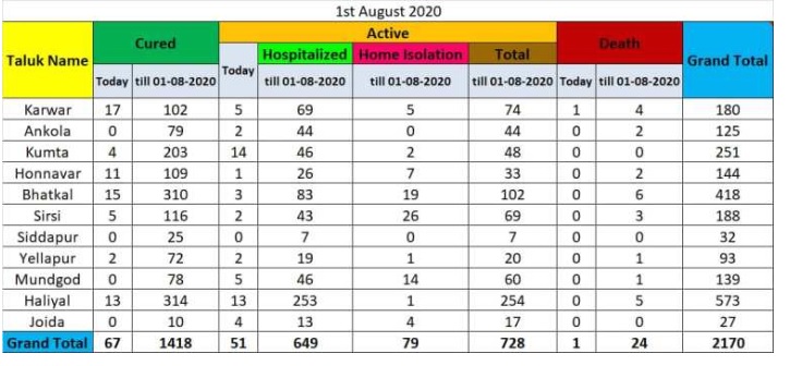 Karwar Today 51 people are been tested positive and 67 people are cured in Uttara Kannada District. One death in Karwar Uttara Kannada District.